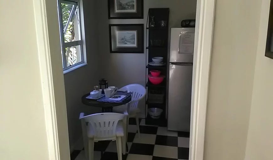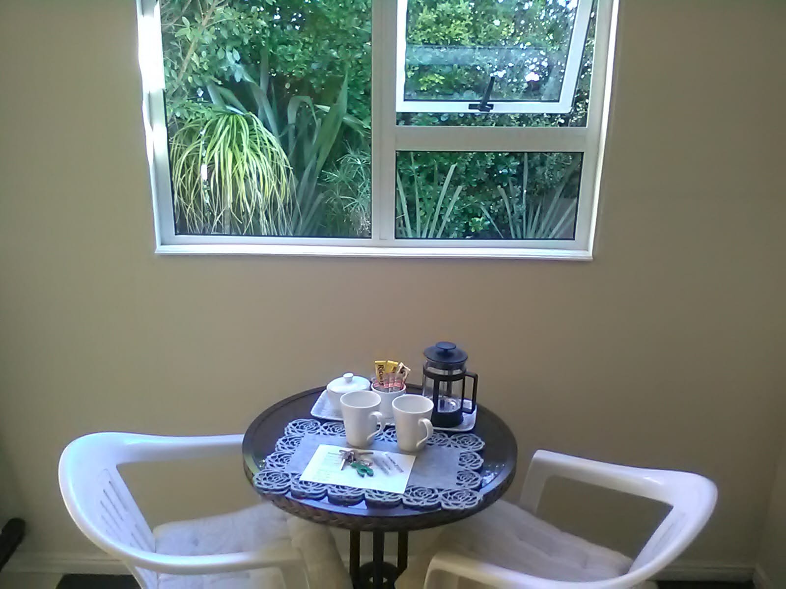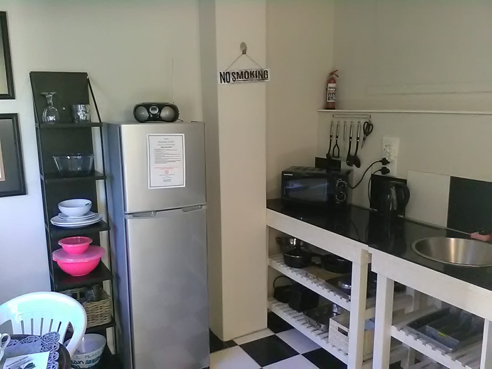 Kitchenette fully equipped with a television, fridge, microwave, toaster, kettle, 2 plate cooker, crockery, cutlery, pots and pan, radio, mini-safe and a breakfast nook.